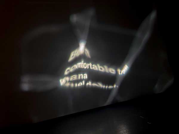 Janosch Perler, Better a cruel truth than a comfortable delusion, Guss-Glasstein, sandgestrahlt mit Schrift, Metallbügel, Mini-Beamer (Bild 2)