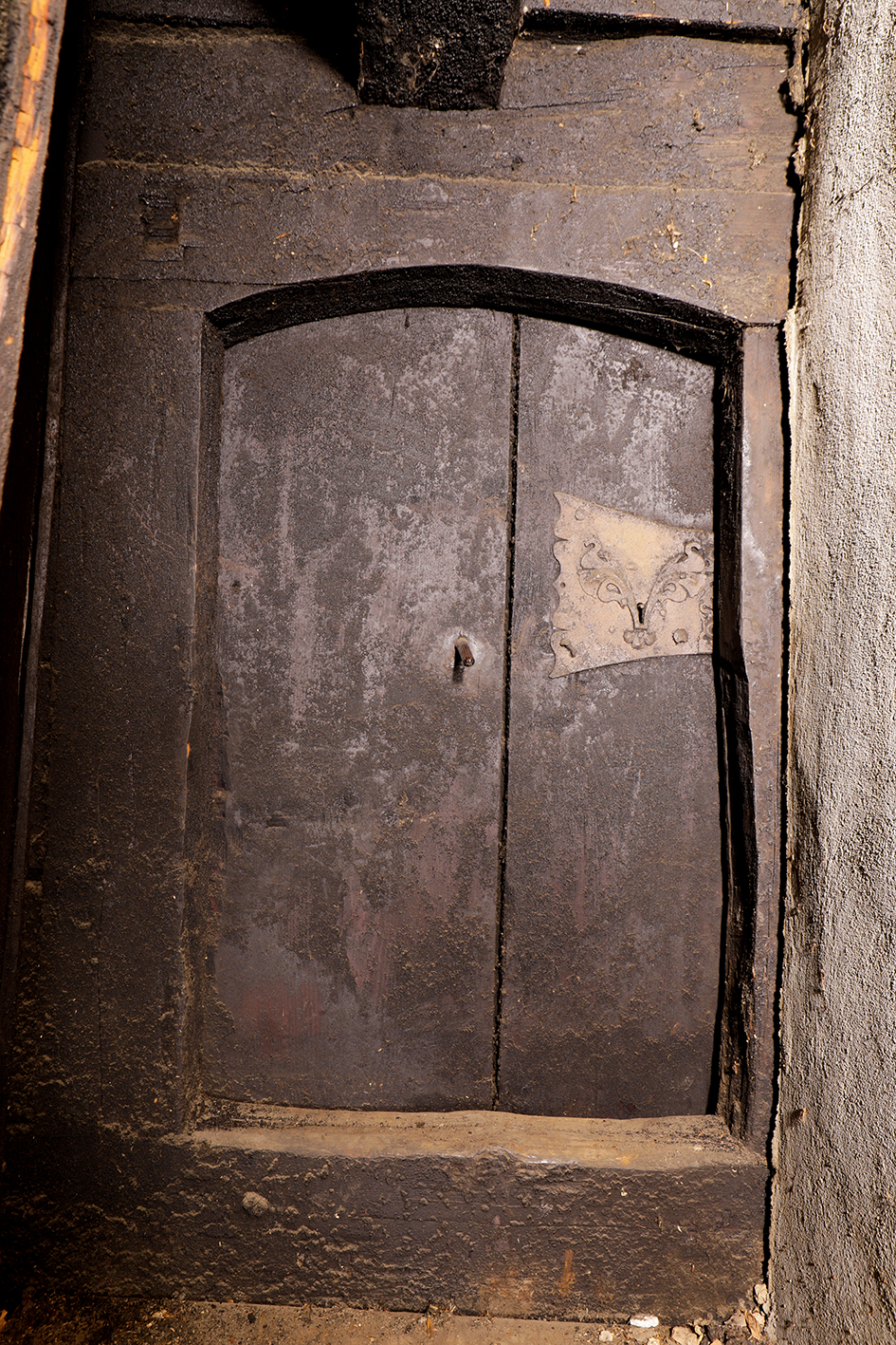 Doch der Zugang zur Firstkammer gibt weiterhin Rätsel auf. Ungewöhnlich ist sowohl, wie die Türe an der Wand angebracht wurde, als auch ihr kunstvolles Türschloss. Das eiserne Schloss, dessen Schlüssel noch vorhanden ist, mutet in Form und Dekor gotisch an. Es passt also zur Datierung von Türblatt und Firstkammer. Vergleichbare Türschlösser des späten 15. oder frühen 16. Jahrhunderts stammen aus herrschaftlichen oder sakralen Bauten – etwa Burgen oder Kirchen.