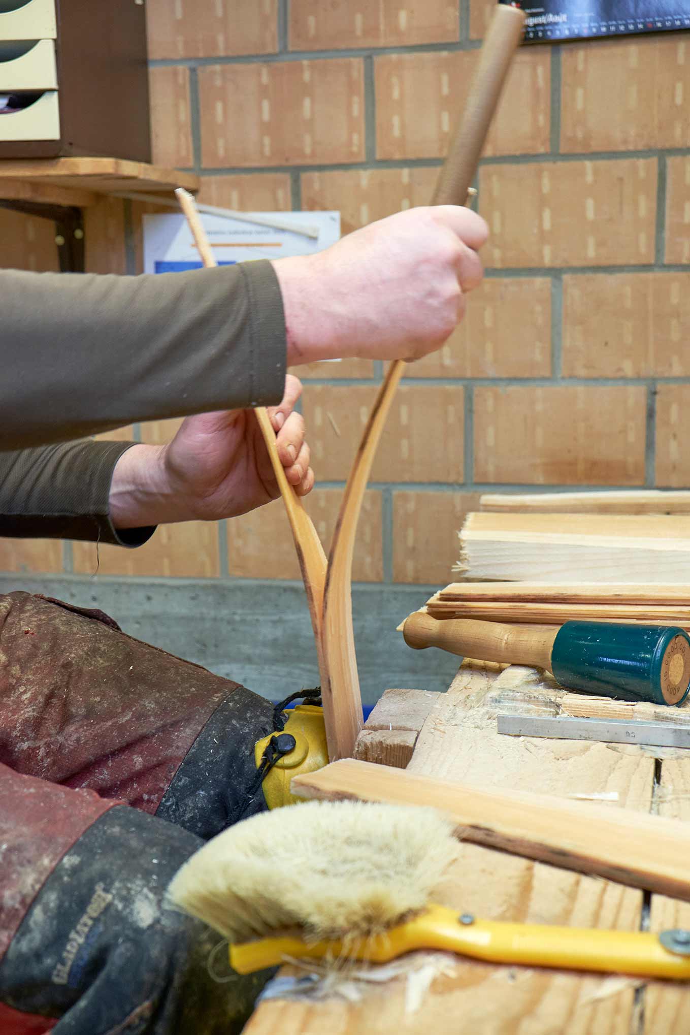 Die Schindelherstellung beginnt mit der Auswahl der Bäume: Am besten eignen sich Fichten aus schattigen Lagen, die auf 1000 Meter oder höher gewachsen sind. Ihr Holz ist fester, die engeren und regelmässigeren Jahresringe erhöhen die Spaltfähigkeit des Holzes. Fritz und Simon Salzmann arbeiten hauptberuflich als Förster und erkennen die geeigneten Stämme. Nach dem winterlichen Holzschlag wird der Stamm entsprechend der gewünschten Schindellänge in Stücke zersägt, diese werden in Viertel gespalten und danach in massgenaue Holzscheite gesägt. Die Aufspaltung eines Holzscheits in einzelne Schindeln ist eine Kunst, die viel Fingerspitzengefühl erfordert. Die Spaltung mit dem Schindeleisen schont die Fasern des Holzes und gewährleistet die Dichtheit der Schindeln. Und schliesslich müssen die fertigen Schindeln möglichst gut belüftet gelagert werden.