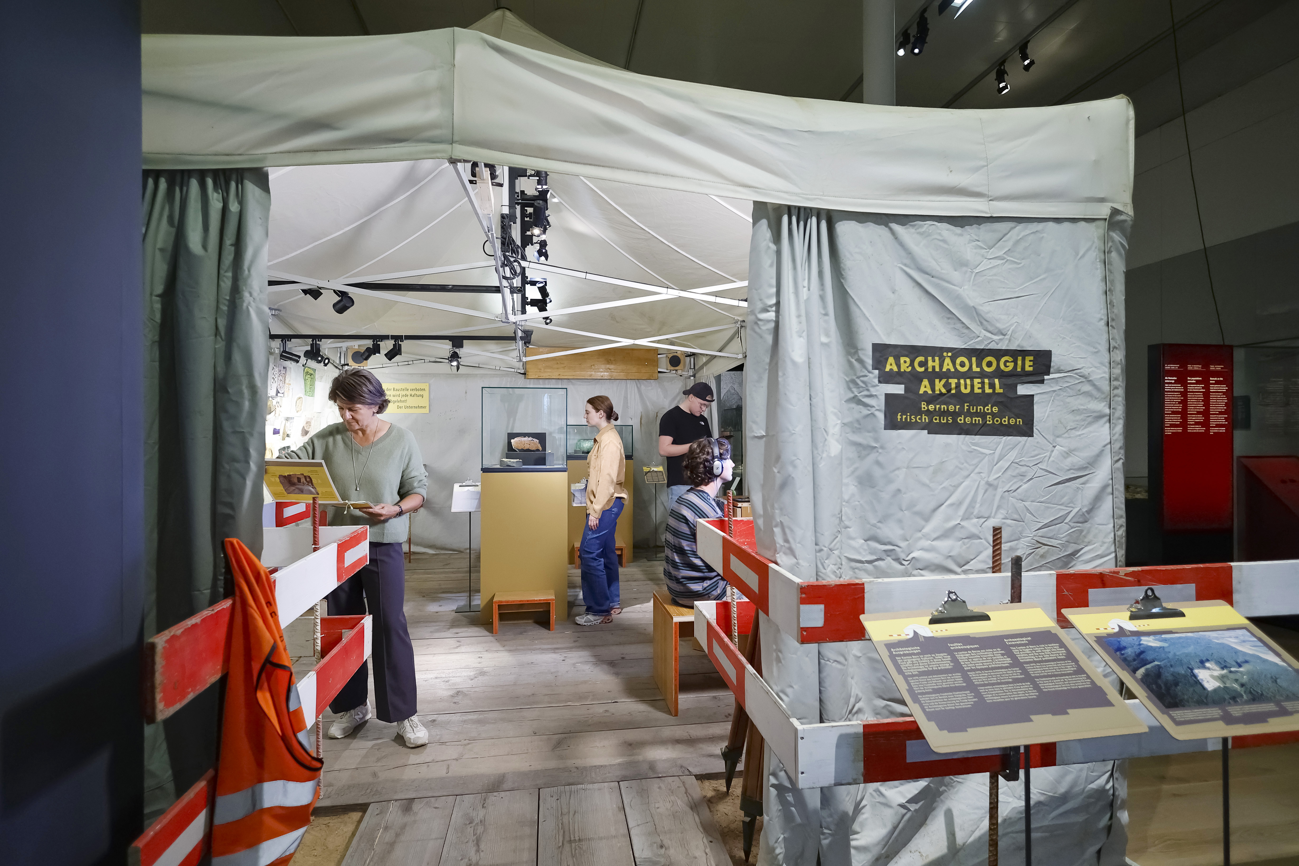 La quatrième exposition temporaire de la série « Nouveautés archéologiques : trouvailles récentes en terres bernoises » ouvre le 28 mars 2024. On pourra y admirer sous la tente de fouille les plus beaux objets archéologiques mis au jour durant les opérations de sauvetage menées dans le lac de Thoune. © Musée d’Histoire de Berne, Stefan Wermuth