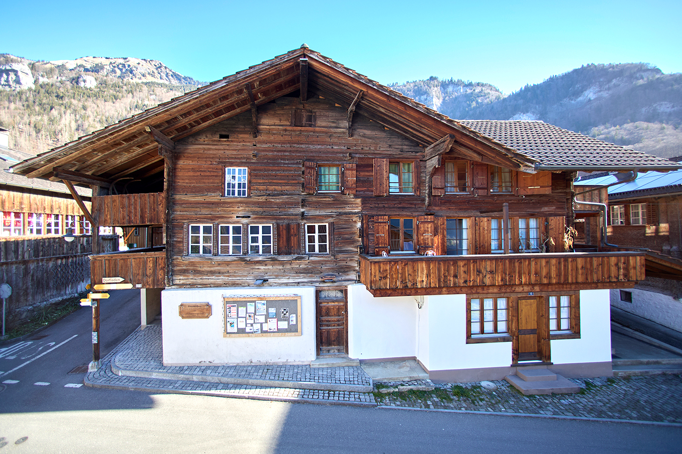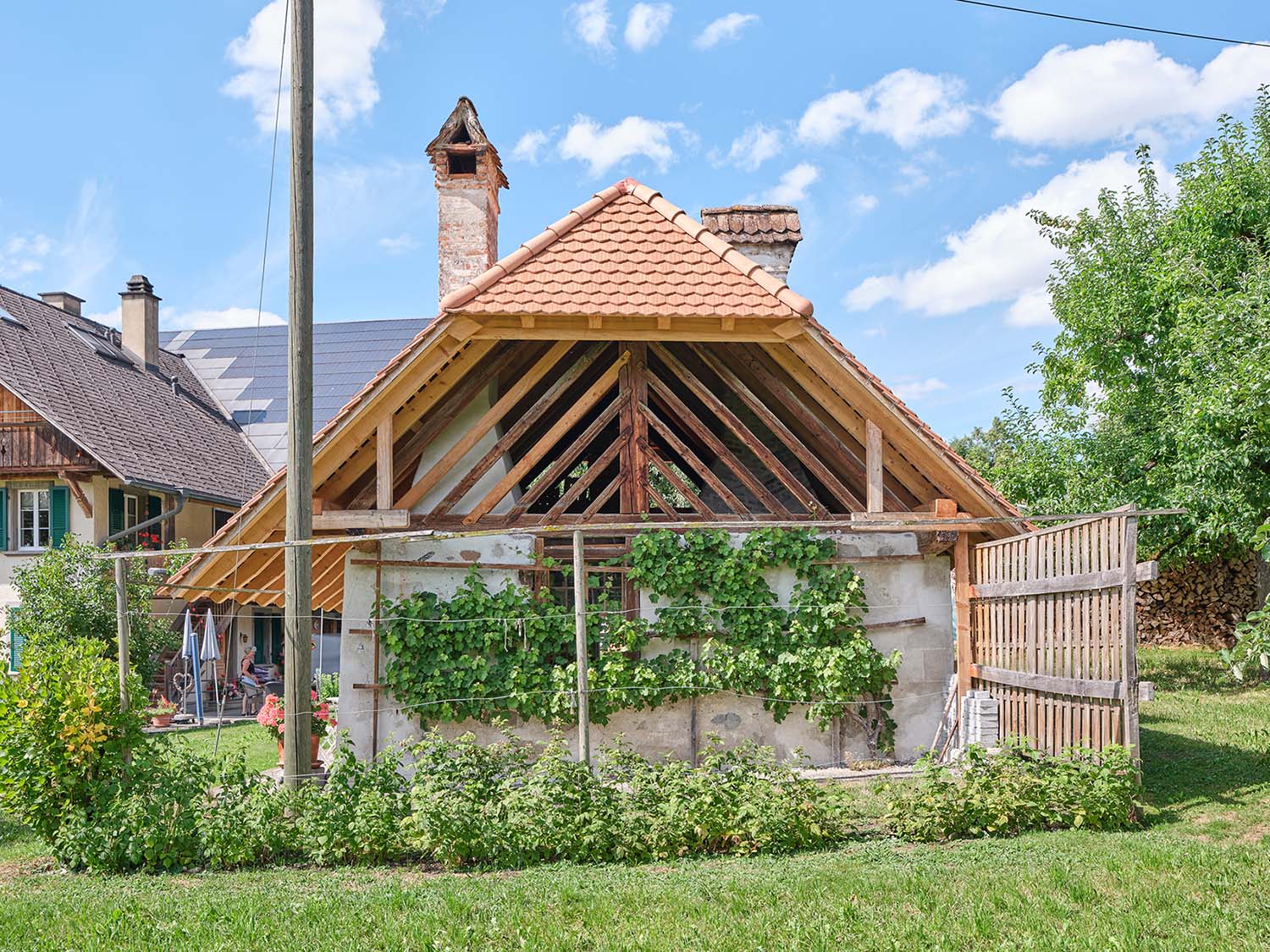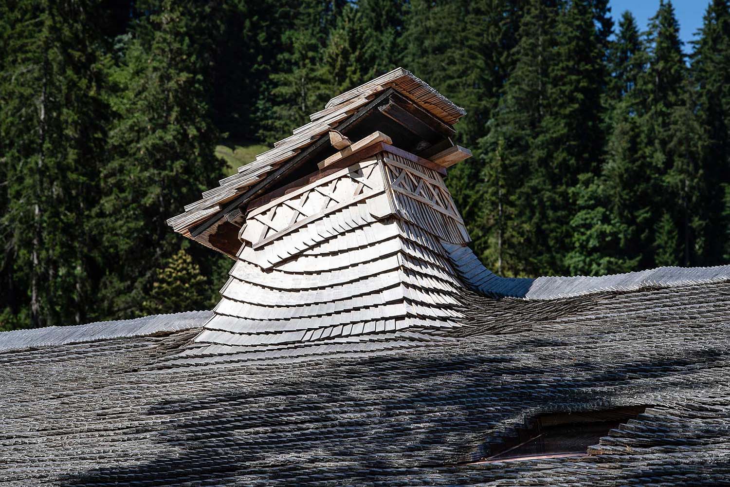 Le toit en tavillons vient d’être restauré avec beaucoup de savoir-faire – y compris la coiffe de cheminée que l’on peut ouvrir ou fermer depuis la cuisine (photo : Christian Helmle).Simplicité architecturale, richesse historique